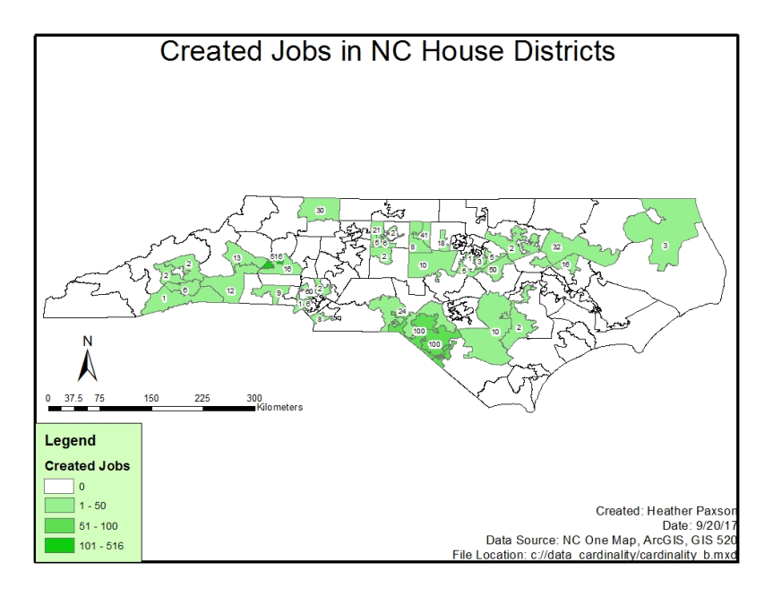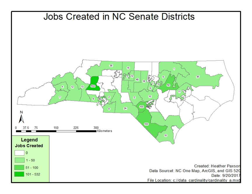 Job creation maps were designed for both North Carolina house districts and North Carolina Senate districts. Both maps present job creation categorically.