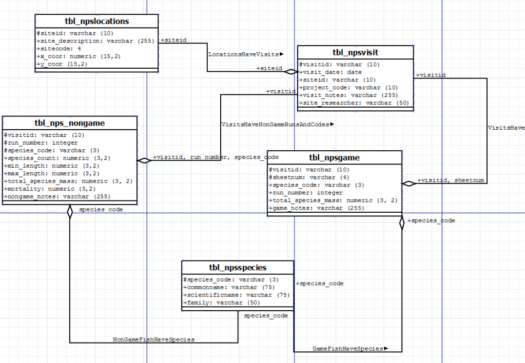 From the previous steps, the five tables and the associated relationships were imported into a PostgreSQL database without issue. The listed tables were site locations, site location visits, observed non-game fish, observed game fish, and fish species’ names.