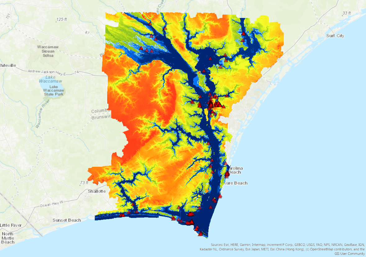 Digital elevation models (DEMs) were taken from NC One map and were combined into one DEM to represent the entire Cape Fear River area. Missing data in the DEM was “filled in” through a moving window. The list of historical sites was clipped to fit this area. A watershed model was created for the Cape Fear River area through the prior calculation of the flow direction, filled sinks, new flow calculation, and an estimated river outlet. To calculate river flooding, I created a very simple model. I decided that the base water elevation was 3 m, as it was the base elevation in Wilmington, where the majority of the sites was located. Each subsequent flooding output would be added on from that determined base elevation.